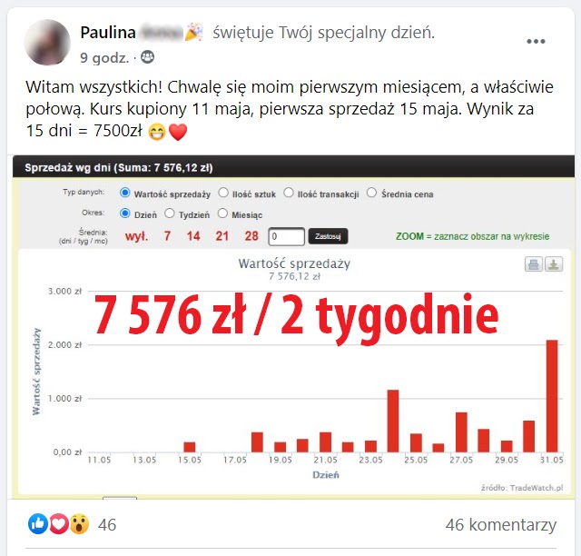 Paulina już w 15 dni od rozpoczęcia uzyskała sprzedaż na poziomie 7 576 zł. I nie zwalniała tempa...