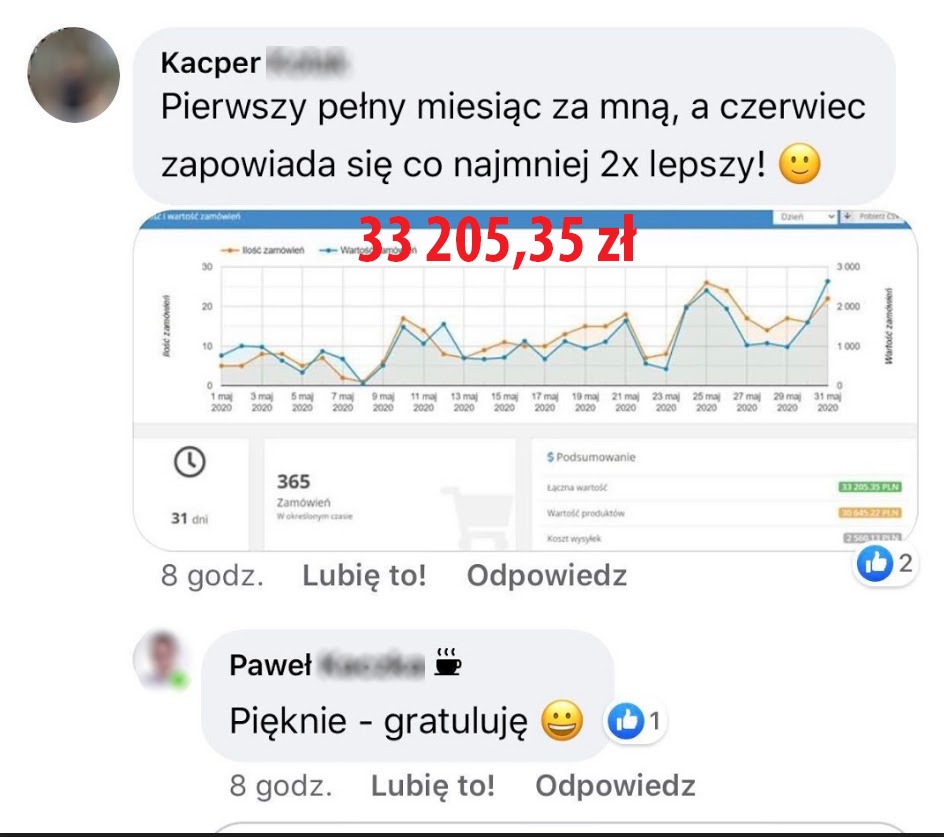 Kacper uzyskał ponad 33 tys. złotych, w swoim pierwszym pełnym miesiącu rozkręcania sklepu internetowego - od zera. Dobra robota Kacper!