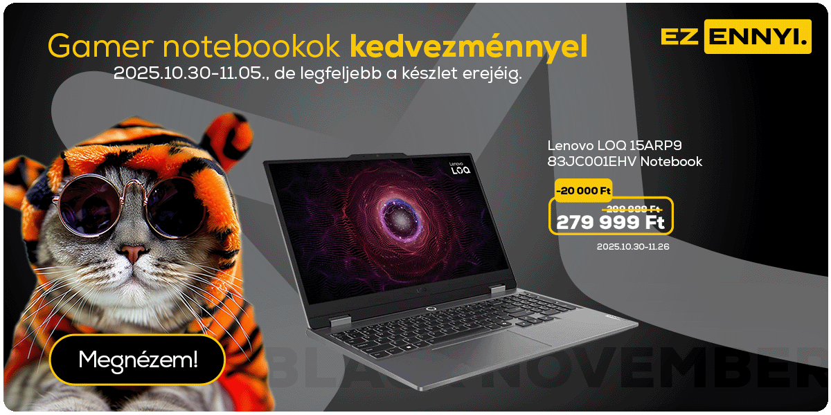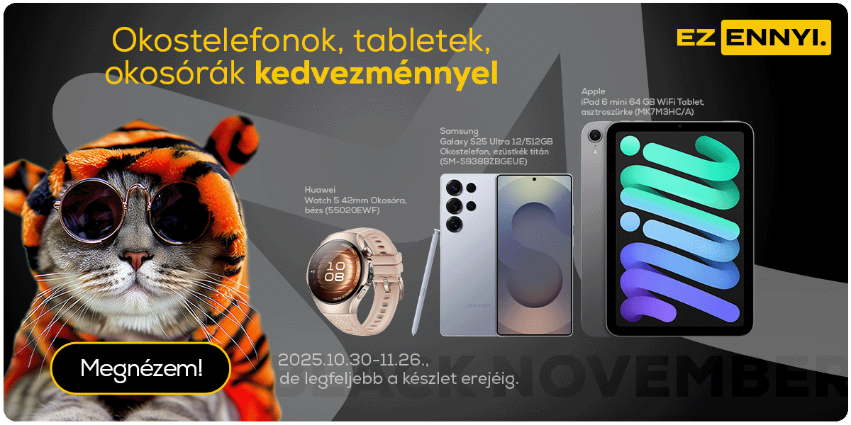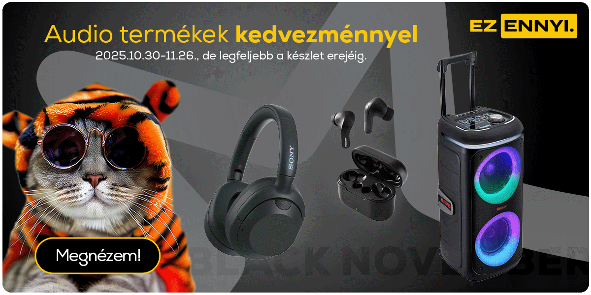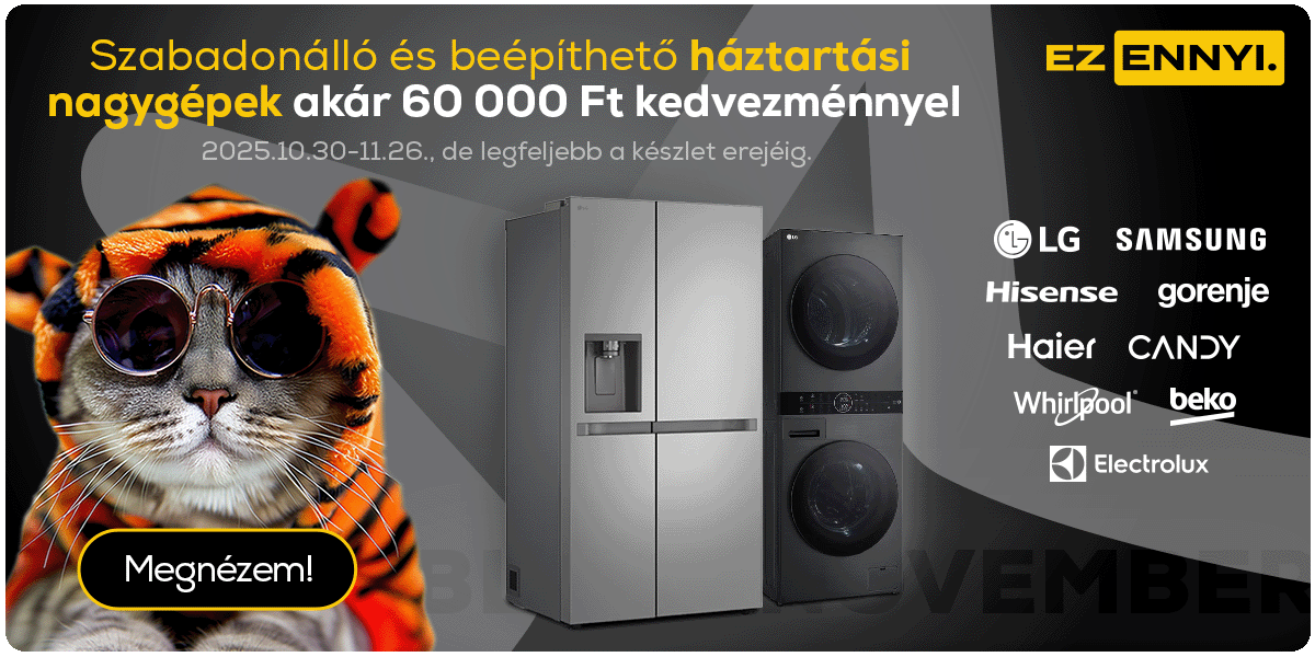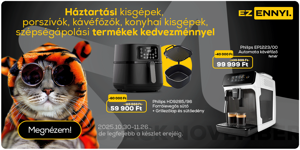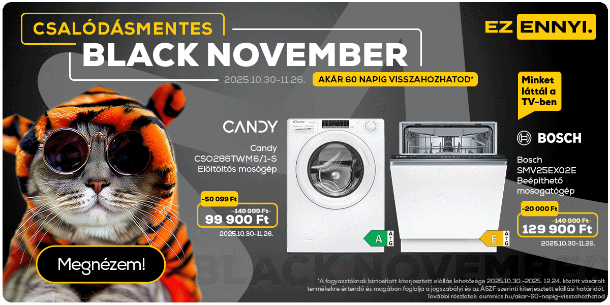 Black november ajánlatok. A Black November ajánlat 2025. 10.30-11.26. között, de legfeljebb a termék készletének erejéig érvényes, kizárólag a megjelölt termékekre, online vásárlás esetén érvényes. Az akcióban résztvevő termékek körét és az akciós árakat illetően fenntartjuk a módosítási és változási lehetőséget. Megjelenítési hibáért felelősséget nem vállalunk. Candy CSO286TWM6/1-S Elöltöltős mosógép, Bosch SMV25EX02E Beépíthető mosogatógép, Philips HD9285/96 Forrólevegős sütő, Samsung RB38C600CS9/EF Alulfagyasztós hűtőszekrény, Panasonic TN-55W70AEZ 55" 4K UHD LED Google TV ajánlat érvényességi ideje 2025. 10.30-11.26. között, de legfeljebb a termékek készletének erejéig érvényes. Samsung LS27CG510EUXEN Odyssey G5 WQHD Gamer monitor ajánlat érvényességi ideje 2025.10.30-11.09. között, de legfeljebb a termékek készletének erejéig érvényes.